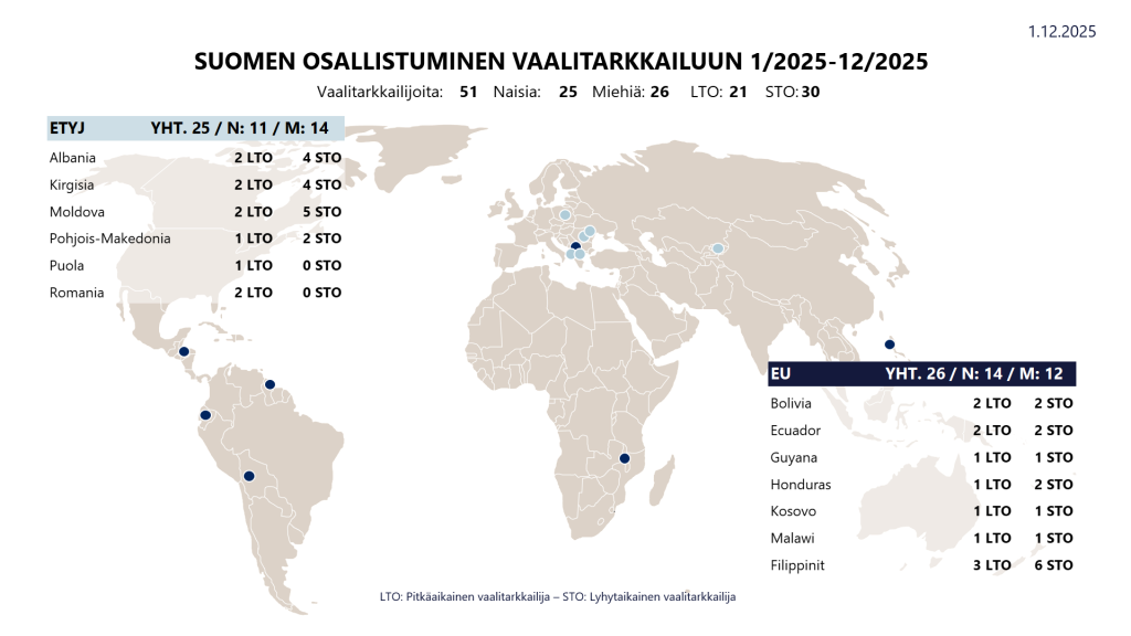 Suomi lähettää vuosittain useita kymmeniä tarkkailijoita EU:n ja Etyj:n vaalitarkkailumissioihin. Alla olevasta kartasta näet, missä CMC:n lähettämiä vaalitarkkailijoita on palvellut tämän vuoden aikana.