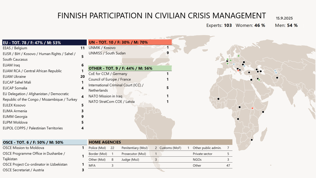 Currently 103 Finnish experts work in international assignments in civilian crisis management missions or secretariats. 46 % of them are women. 78 experts serve in the assignments of the EU, ten in the UN and six in the OSCE. Nine experts work in other organisations.