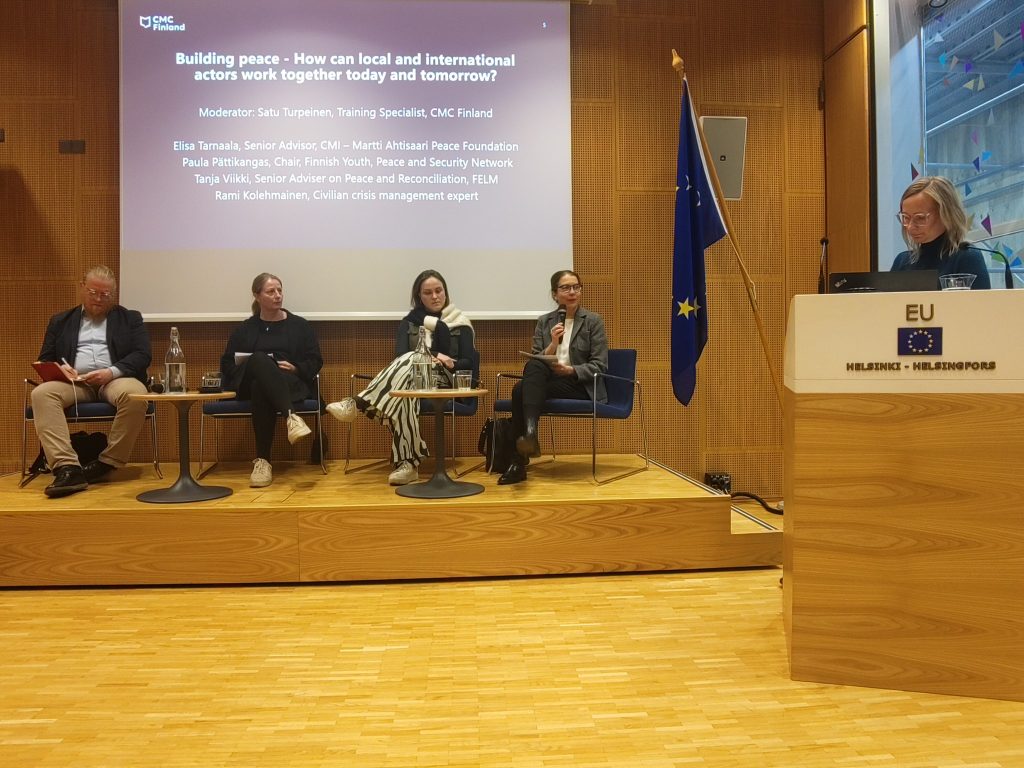 The second part of the seminar was a panel discussion. The panel consisted of Paula Pättikangas from Finnish Youth, Peace and Security Network, Rami Kolehmainen, a civilian crisis management expert, Dr. Elisa Tarnaala from CMI – Martti Ahtisaari Peace Foundation and Tanja Viikki from Felm. The panel was moderated by Satu Turpeinen from CMC Finland.