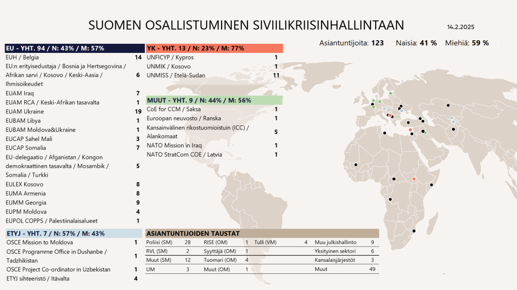 Tällä hetkellä 123 suomalaista asiantuntijaa osallistuu kansainvälisiin tehtäviin siviilikriisinhallinnan operaatioissa tai sihteeristötehtävissä. Heistä naisia on 41 %. 94 asiantuntijaa palvelee EU:n palveluksessa, 13 YK:n ja seitsemän Etyjin tehtävissä. Muissa organisaatioissa työskentelee yhdeksän asiantuntijaa.