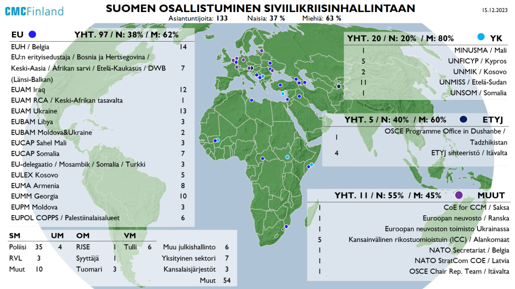 Tällä hetkellä 133 suomalaista asiantuntijaa osallistuu kansainvälisiin tehtäviin siviilikriisinhallinnan operaatioissa tai sihteeristötehtävissä. Heistä naisia on 37 %. 97 asiantuntijaa palvelee EU:n palveluksessa, 20 YK:n ja viisi Etyjin tehtävissä. Muissa organisaatioissa työskentelee 11 asiantuntijaa.