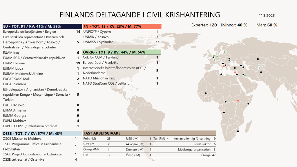 För närvarande tjänstgör 120 finländska experter i internationella civil krishanteringsuppdrag och i internationella organisationernas sekretariat. 40 % av dem är kvinnor. 91 experter tjänstgör i EU, 13 i FN och sju i OSSE. Nio experter arbetar i övriga organisationer.