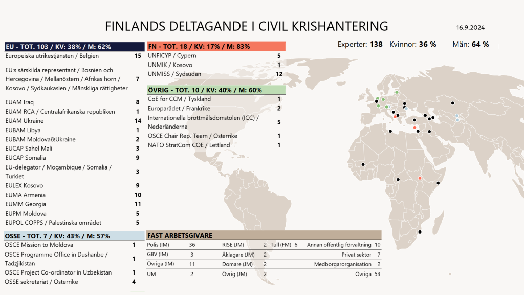 För närvarande tjänstgör 138 finländska experter i internationella civil krishanteringsuppdrag och i internationella organisationernas sekretariat. 36 % av dem är kvinnor. 103 experter tjänstgör i EU, 18 i FN och sju i OSSE. Tio experter arbetar i övriga organisationer.